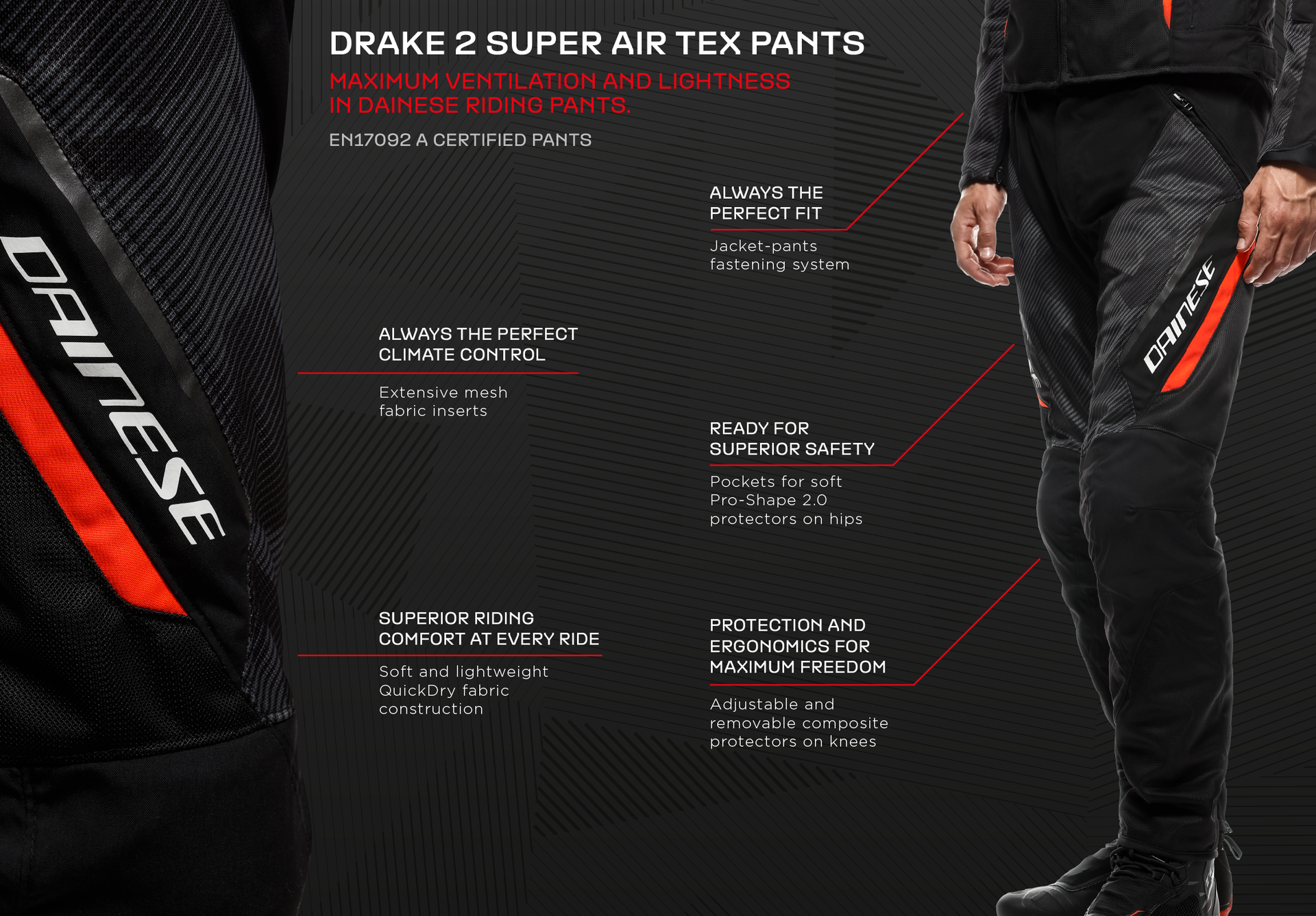 Conceived for motorcycle outings in the middle of the summer, Drake 2 Super Air Tex Pants are motorcycle pants made of soft and lightweight fabric, whose construction features an extensive mesh surface that guarantees maximum ventilation even on sweltering days.