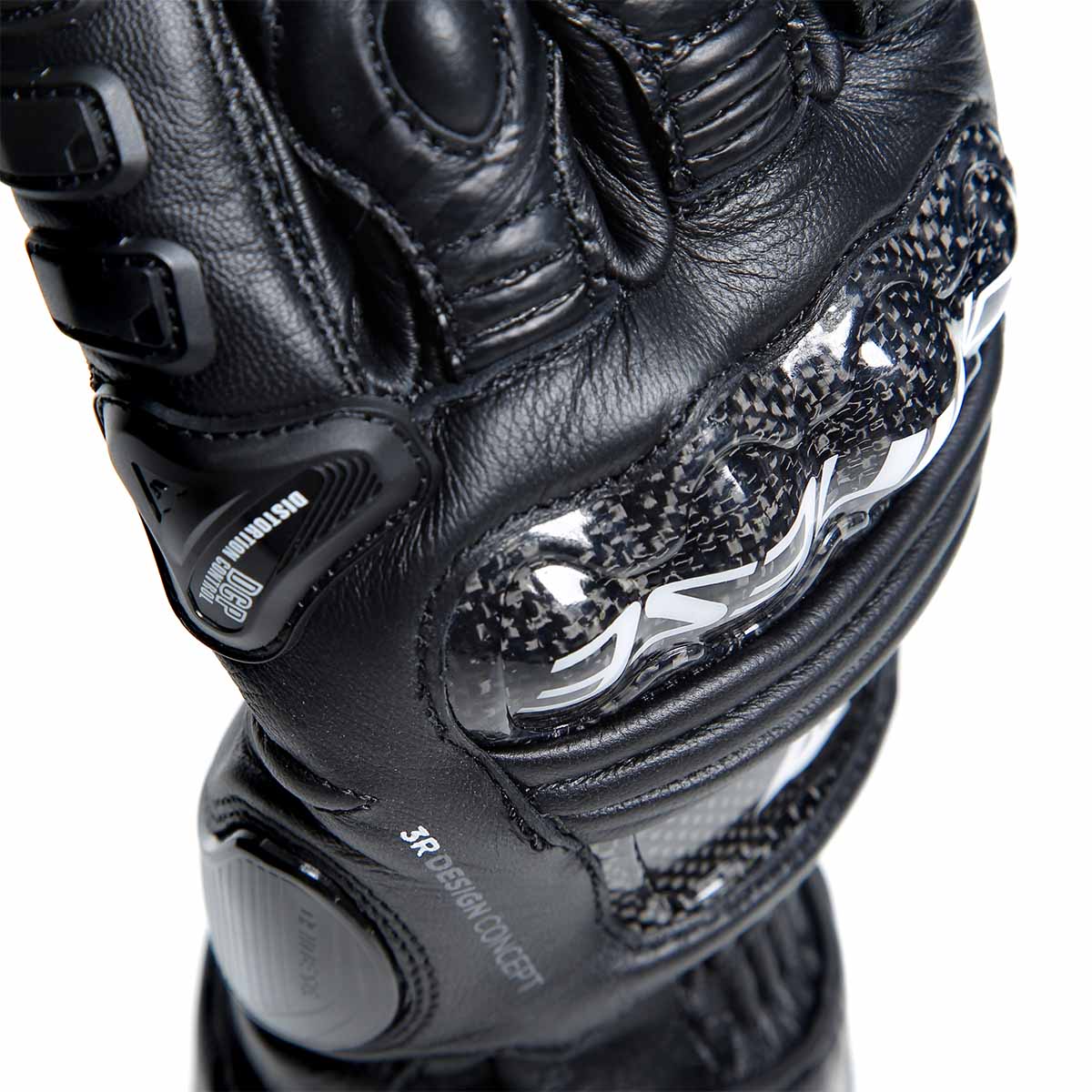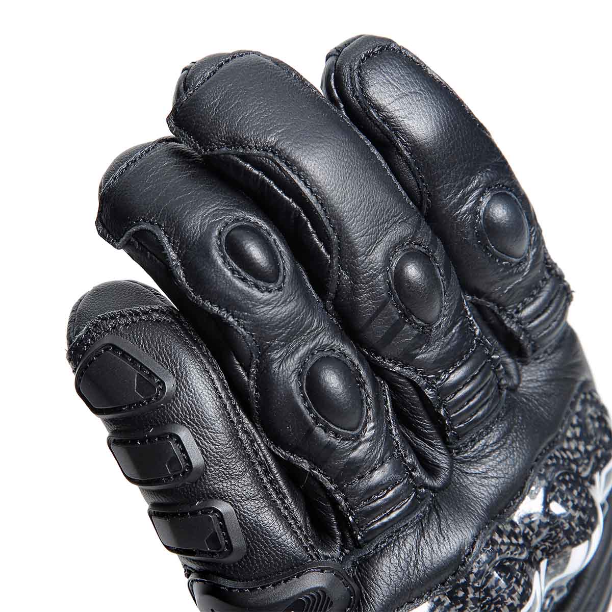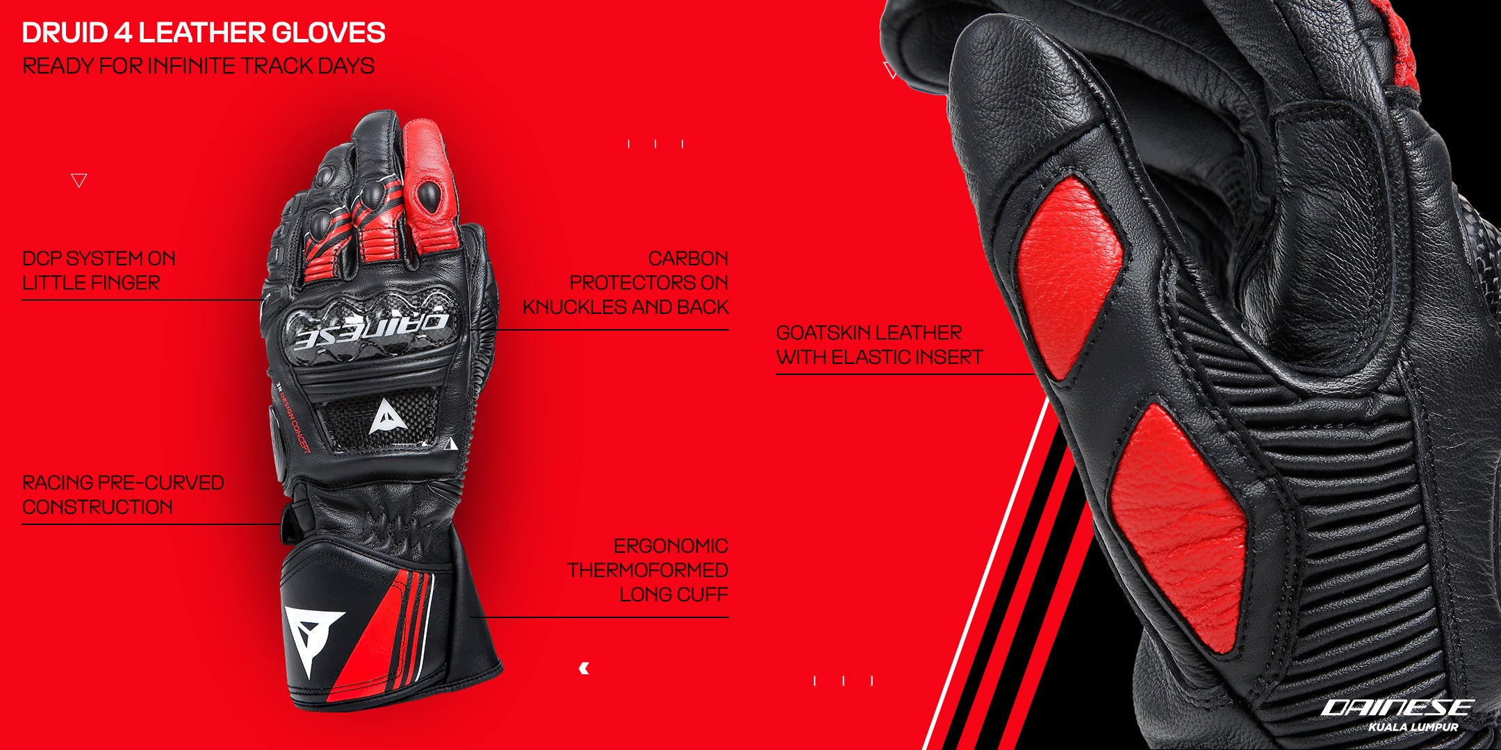 The Dainese Druid 4 leather racing gloves are an expression of the highest protection standards, designed for maximum performance on the track and the road. World Championship safety and ergonomics are guaranteed by the presence of the pre-curved and thermoformed sleeve, the carbon inserts on the knuckles and back, and the thermoplastic protector on the little finger.