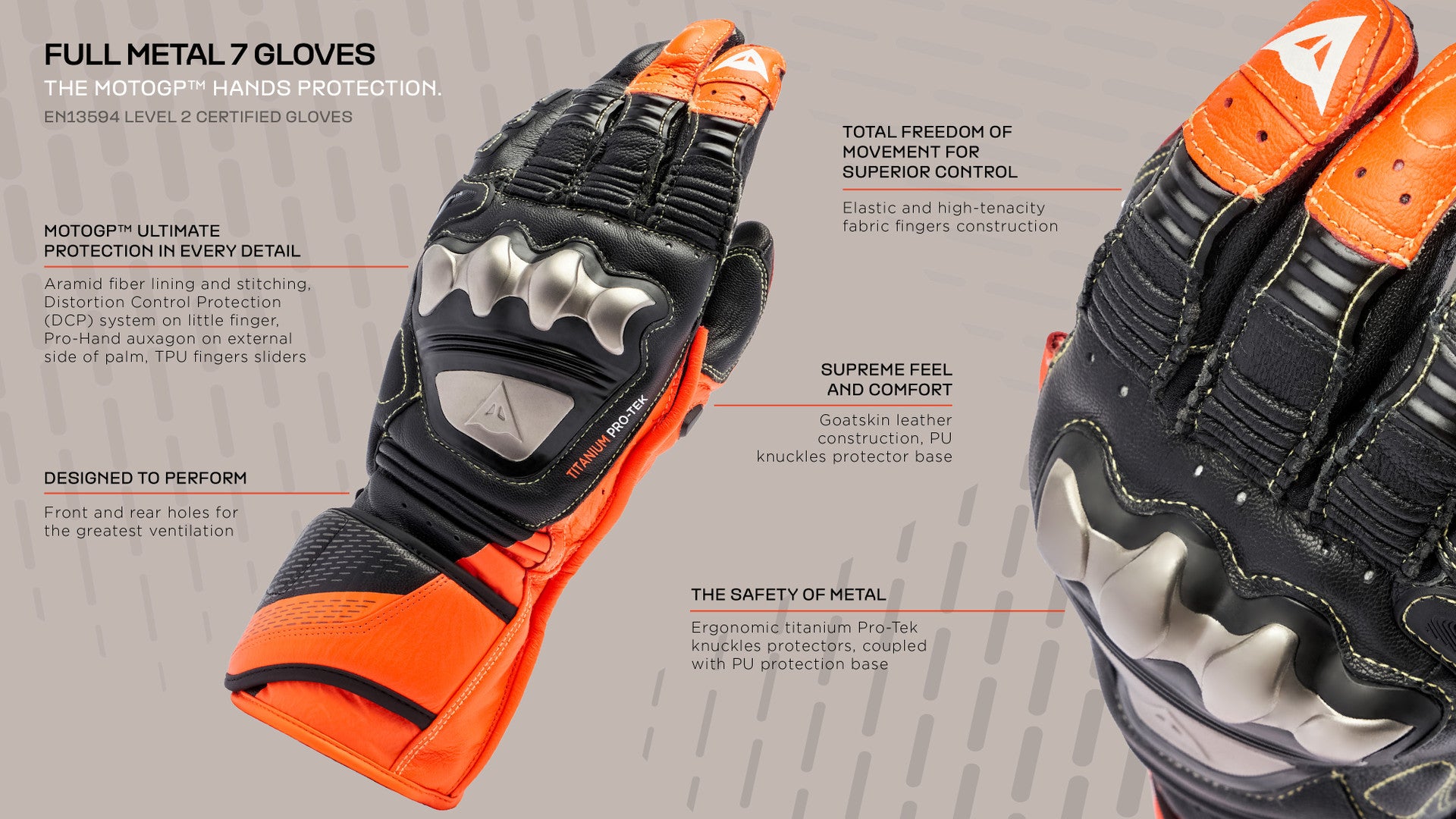 The perfect blend of iconic design and Dainese’s high technological standards, Full Metal 7 Gloves embody the latest evolution of top-of-the-range racing gloves, with additional Level 2 certification.Full Metal 7 Gloves’ construction ensures a perfect connection to Dainese’s racing suits.