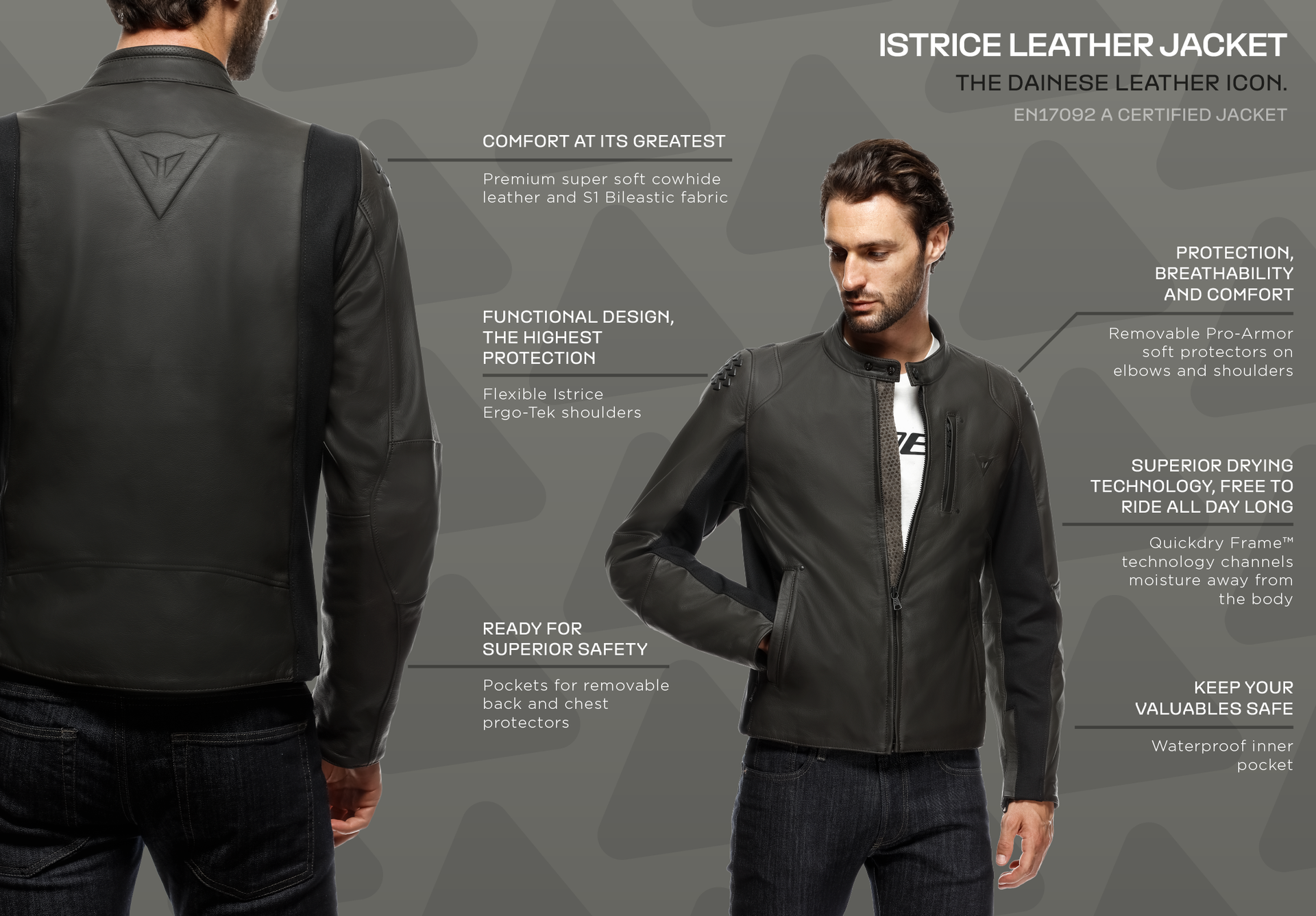 In addition to the ventilation provided by localized perforation on the garment’s most strategic areas, maximum thermal comfort is ensured by Quickdry Frame™ technology that allows moisture inside the jacket to evaporate more quickly, making it the ideal solution even on the hottest days – without having to give up the safety provided by a leather garment.