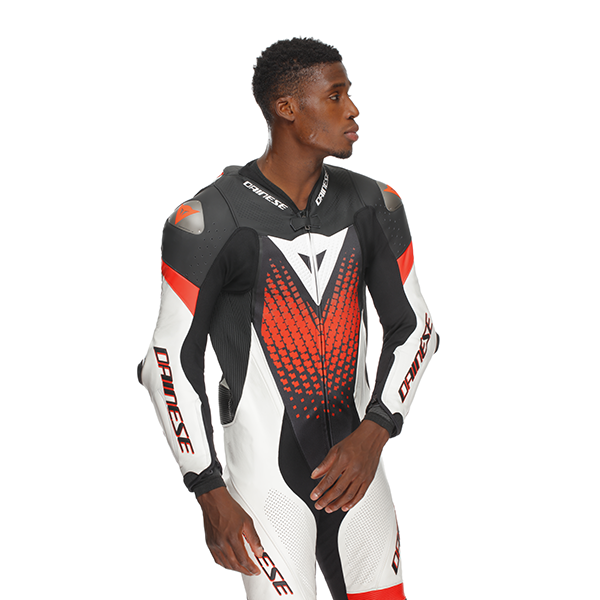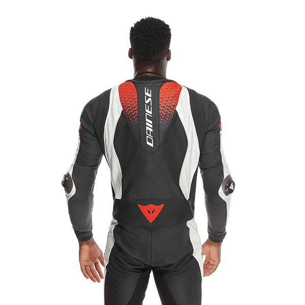 Conceived for all those motorcycle riders who challenge the limits of speed and love to test themselves on the track, the Laguna Seca 6 suit is designed to guarantee maximum freedom of movement in the saddle, with ergonomic levels featuring optimal performance. Its exclusive construction integrates wide stretch inserts both in leather – such as the Dainese Tri-Axial system on the back guaranteeing perfect mobility and maximum resistance – and in stretch fabric, such as the wide front panel that follows the rider’s body shape, maximizing comfort.