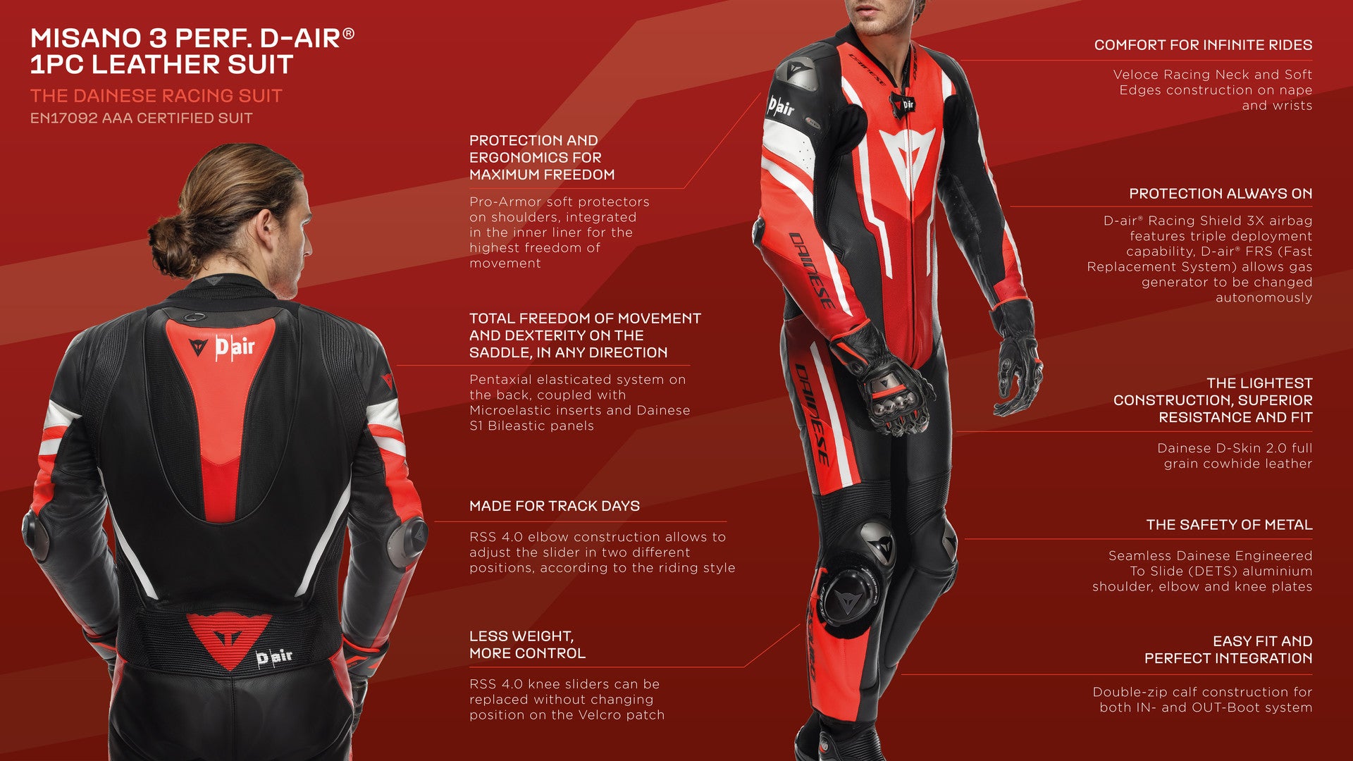 Constructed of high-quality D-Skin 2.0 full-grain cowhide, Misano 3 Perf. D-air® is designed to offer maximum levels of performance and safety on the track. Maximum performance is ensured by the technologies used to make the suit, with the result that it’s extremely ergonomic and lightweight.