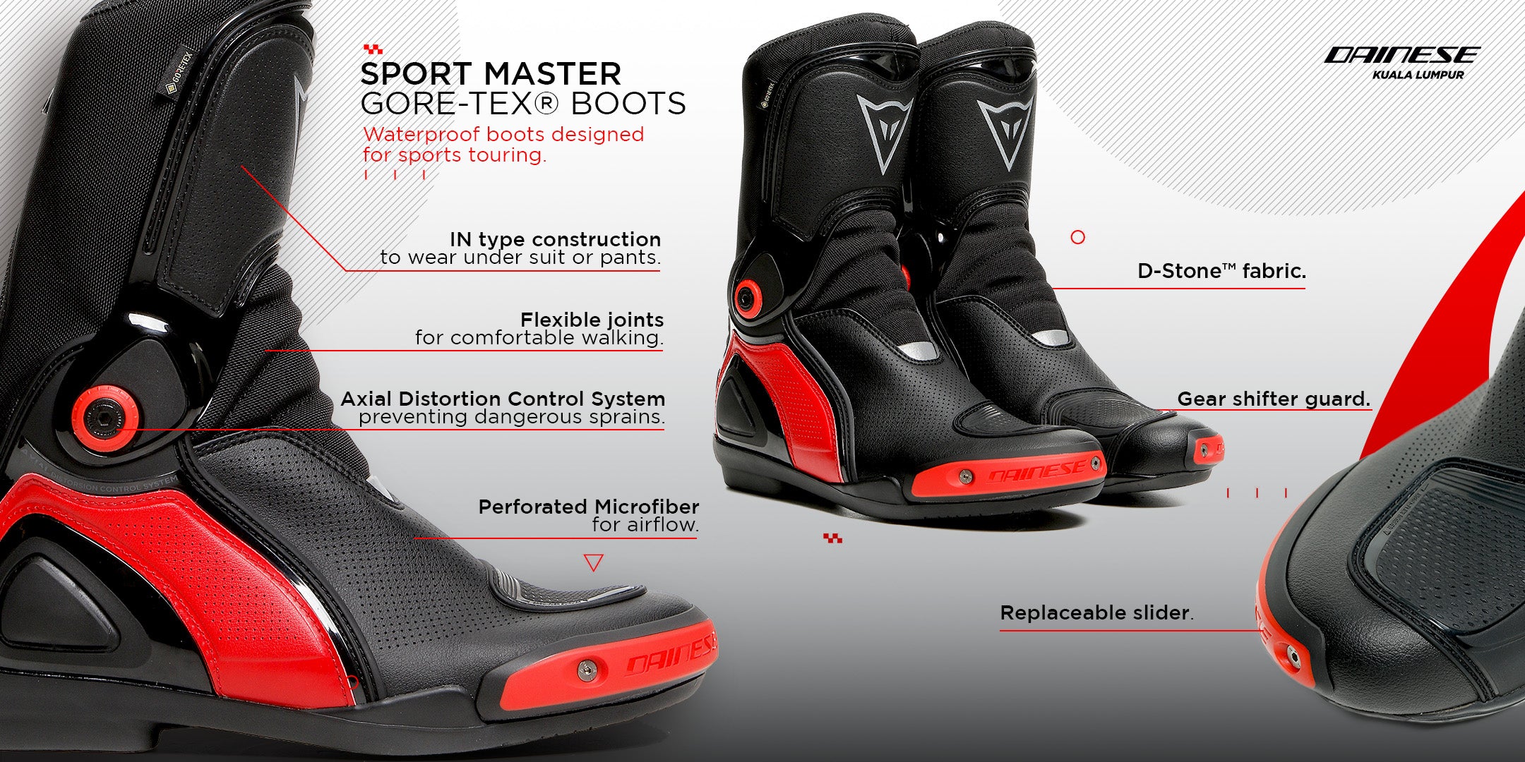 A waterproof boot with GORE-TEX® membrane for sports touring use, complete with the Axial Distortion Control System to protect the foot and ankle and IN construction, to be worn under the suit or pants.